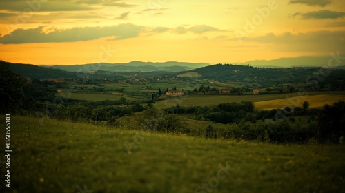 © MohamadIzzudin, Obraz premium Serene Landscape at Dusk with Rolling Hills and Golden Sky