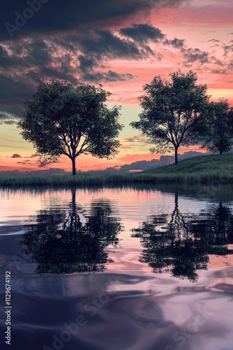 Fototapeta premium Serene landscape at dusk with two trees reflecting in calm water under a...