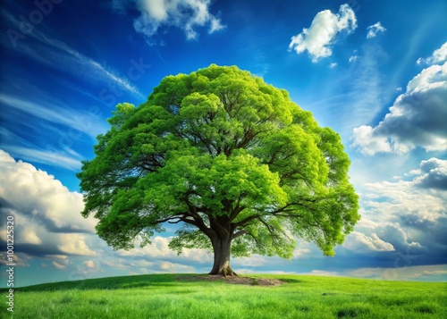 © Supittra, Obraz premium Serene landscape featuring a majestic deciduous tree with sprawling branches and vibrant green leaves set against a