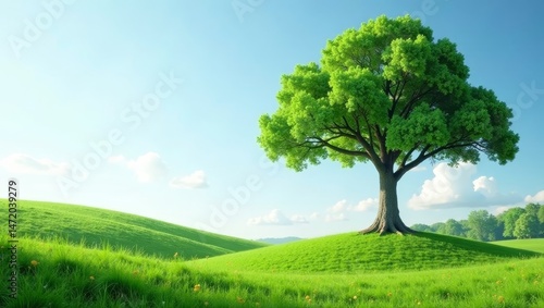 Fototapeta premium Serene landscape featuring a majestic tree on a verdant hill under a clear sky