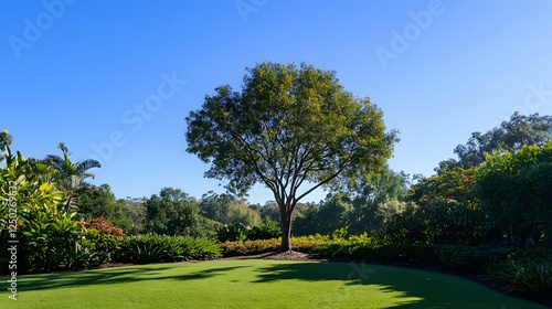 Naklejka premium Serene Landscape Featuring a Solitary Tree and Lush Greenery