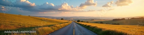 Fototapeta premium Serene landscape featuring a winding country road disappearing towards a distant horizon over rolling hills and fields under a vast sky , calm, image