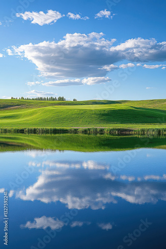 Obraz premium Serene landscape featuring green rolling hills and a clear blue sky reflected...