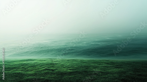© JCreative, Obraz premium serene landscape featuring misty ocean view with lush green grass in foreground, creating tranquil atmosphere