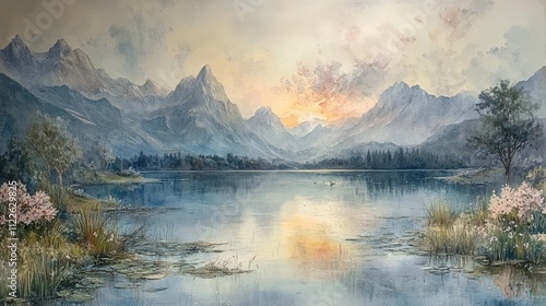 © tengah, Fototapeta premium Serene landscape featuring mountains, a calm lake, and a colorful sunset.