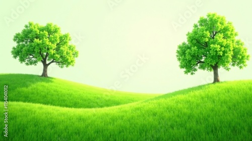 © vattana, Fototapeta premium Serene Landscape Featuring Two Lush Green Trees on Rolling Hills Under a Bright Sky