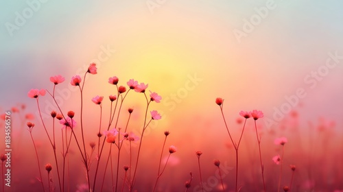 © buraratn, Naklejka premium Serene Landscape of Delicate Pink Flowers Under a Soft Colorful Sunset in a Dreamy Atmosphere of Nature's Beauty and Tranquility in the Evening Light