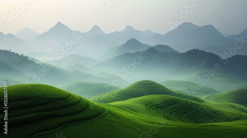 Fototapeta premium Serene Landscape of Lush Green Hills and Majestic Mountains Under a Soft Misty Sky at Dawn in Vibrant Nature Scene