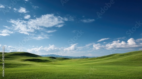 Fototapeta premium Serene landscape of rolling green hills under a vibrant blue sky dotted with...