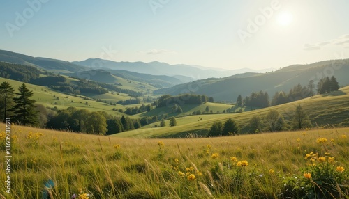 © Kitta Studio, Fototapeta premium Serene Landscape of Rolling Green Hills Under Bright Blue Sky