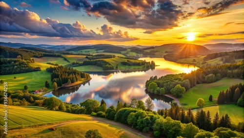 © Man888, Fototapeta premium Serene landscape of rolling hills, dense forests, and sparkling lakes creating a picturesque scenery in a rural region during the warm sunset hours.