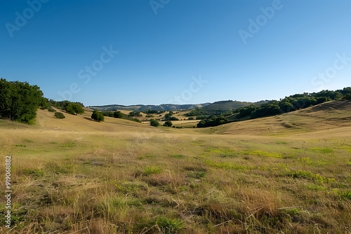 Fototapeta premium Serene Landscape of Rolling Hills Under a Clear Blue Sky