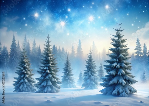 Naklejka premium Serene landscape of snow-covered evergreen trees surrounded by misty fog, set...
