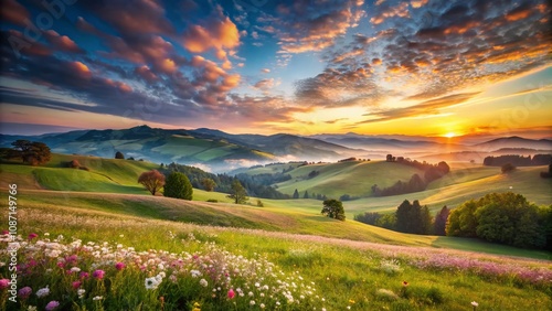 © Adisorn, Fototapeta premium Serene Landscape Photography Evoking the Comfort of Sleep: Tranquil Mountains, Soft Clouds, and Gentle Meadows at Dawn