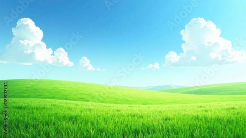 © parichart, Obraz premium Serene Landscape Rolling Green Hills Under a Bright Blue Sky with Fluffy White Clouds