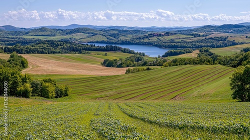Fototapeta premium Serene Landscape: Rolling Hills, Lush Farmland, and a Tranquil Lake Under a Summer Sky