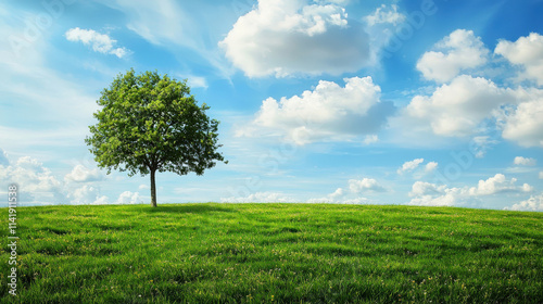 Fototapeta premium Serene Landscape Scene with Lush Green Grass and Lone Tree Under Bright Blue Sky with Fluffy White Clouds