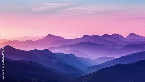 Obraz premium Serene landscape showcasing a vast mountain range bathed in the soft hues of a pastel sunset, with layers of peaks receding into a hazy, purple-blue distance