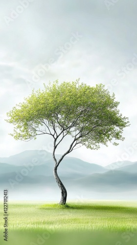 Fototapeta premium Serene Landscape Solitary Tree in Misty Mountain Field