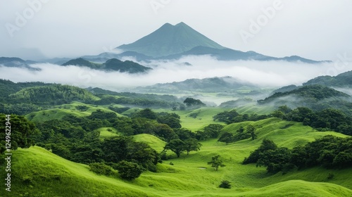 Obraz premium Serene landscape view of lush green hills and misty mountains in nature's...