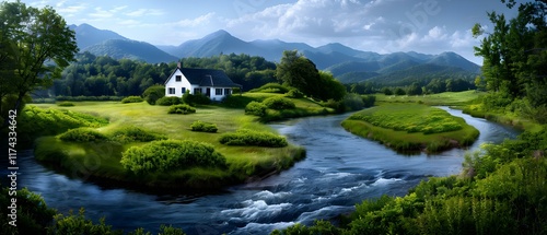 Fototapeta premium Serene Landscape with a House by a River Surrounded by Lush Greenery and...
