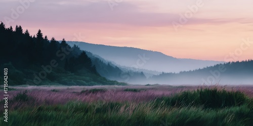 © progressman, Fototapeta premium serene landscape with a purple sky and a misty, foggy atmosphere