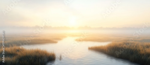 © Waraporn, Fototapeta premium Serene landscape with a tranquil lake or river reflecting the warm glow of the setting or rising sun surrounded by lush reeds and grasses under a dramatic sky at dusk or dawn