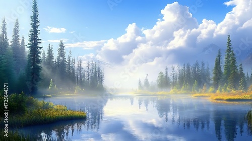 © humaira, Fototapeta premium Serene landscape with a wooden bridge crossing quiet stream