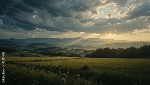 © Kitta Studio, Fototapeta premium Serene Landscape with Dramatic Clouds and Golden Sunlight at Dusk