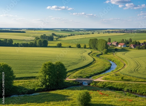 © Kitta Studio, Fototapeta premium Serene Landscape with Farmland, River, and Scenic Horizon View