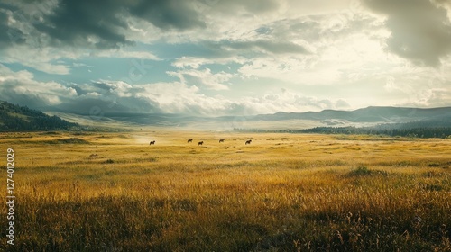 © Tuachan, Obraz premium Serene Landscape with Horses Grazing in Open Golden Field