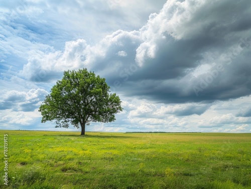 Obraz premium Serene Landscape with Lone Tree and Dramatic Cloudy Sky - Tranquil Meadow, Vibrant Green Tree, Atmospheric Clouds, Peaceful Solitude - Nature Stock Photo