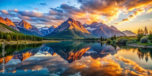 Fototapeta premium Serene Landscape with Majestic Mountains and Reflective Lake Under a Bright...