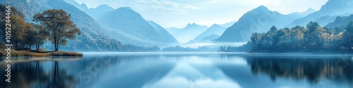 © Dikina, Fototapeta premium Serene landscape with mountains reflected in a calm lake.