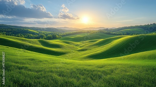 © julio, Obraz premium Serene landscape with rolling green hills and a sunset backdrop.