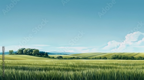 Naklejka premium Serene landscape with rolling hills, green fields, and a clear blue sky.