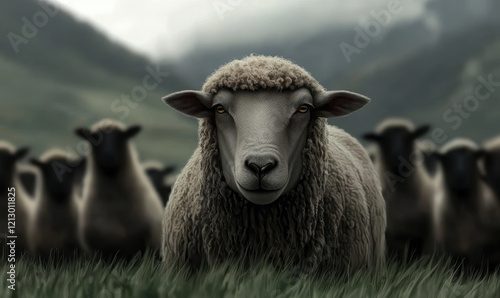 Fototapeta premium Serene Landscape with Sheep Grazing Peacefully in Rolling Green Pastures Amidst Majestic Valleys and Lush Meadows