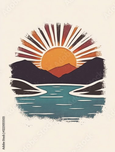 © Namdang, Obraz premium Serene Landscape with Sun Rising Over Calm Water and Mountains