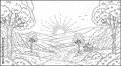 Fototapeta premium Serene landscape with sunrise over hills, trees, and a small house