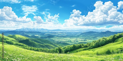 © Afif, Obraz premium Serene landscape with trees, hills, and bright sky