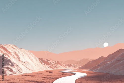 © Multiverse, Naklejka premium Serene landscape with winding river flowing through mountains under a soft sunset sky