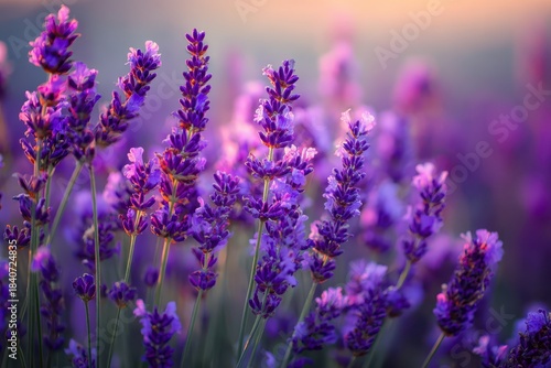 Naklejka premium Serene Lavandula Landscape: Closeup of Violet Flowers at Sunset in Provence,...