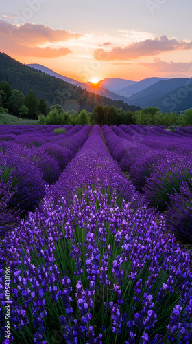 © Bartek, Fototapeta premium Serene Lavender Field at Sunset in Puimoisson, Provence, France - Vibrant Blooming Rows with Calm Summer Sky and Scenic Hills