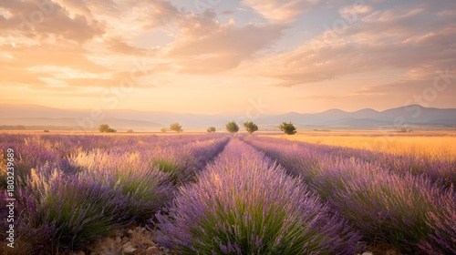 Fototapeta premium Serene Lavender Fields at Sunset with Beautiful Sky and Mountains