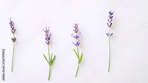 © PFU, Obraz premium Serene lavender sprigs arranged against a soft white background, a minimalist botanical study evoking calmness and tranquility.