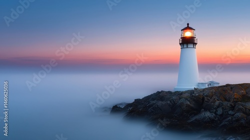 © AtomMaya, Naklejka premium Serene Lighthouse at Dusk with Calm Ocean and Colorful Sky