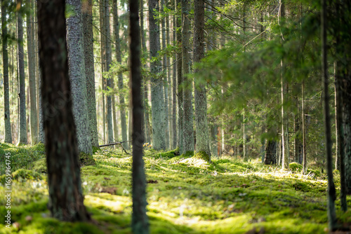 Naklejka premium Serene Lithuanian forest with tall pines, moss-covered ground, and lush...