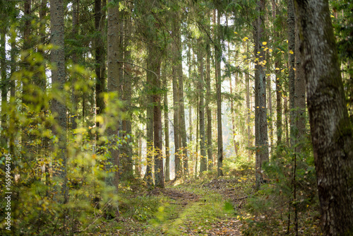Naklejka premium Serene Lithuanian forest with tall pines, moss-covered ground, and lush...