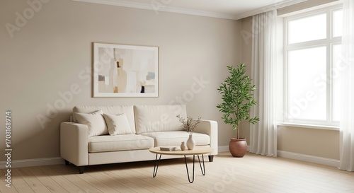 Fototapeta premium Serene Living Room Design Featuring a Comfortable Sofa and Bright Natural Light