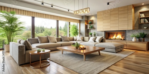 © nick, Fototapeta premium Serene living room: neutral sectional sofa anchors the space, fireplace adds warmth, minimal coffee table completes the scene.